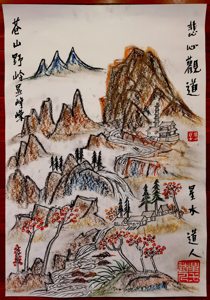 生活之中,我患有比较严重的自闭症与社交恐惧症,我是一个不合群的人,我是一个颓废的人,我是一个缺乏乐观精神与盲目自信心的人,我是一个在精神世界里无依无靠的人,我也是一个信仰迷茫、失魂落魄的人。经年以来,我已经习惯于孤独地踯躅行走在茫茫的人海之中,前方尽是无涯无际的苍凉荒原阡陌,面对巍峨嶙峋、形态诡异的苍茫山峰,我两眼茫然、无力攀爬,似乎只能半途而废。别人借酒消愁,我则借画慰藉孤独的灵魂,排遣内心的孤独、寂寞、空虚与忧伤。所以,我的画是属于无聊,也是颓废的,更是荒诞的,不值一提,只是我的灵魂写照的涂鸦反射,也是我的潜意识的精神折射,更是我心灵深处的苦涩甘泉的不经意的流淌出来的涓涓细流,可能其中蕴含有一点世人皆浊我独醒的愤世嫉俗营养价值,但是也一定依稀包含着精神颓废的瘾君子的荒诞不经的黯淡色调,如果一定将其称之为意识流文人画或者间歇性精神错乱者的涂鸦之作,我想应该亦不为过吧。但是,百年之后,大概率可能石沉大海,被无情地湮灭在历史的黄沙之下,毕竟百年身后事,历史上功成名就的人物只是命运眷顾的幸运宠儿,就像中了彩票百万大奖的赌徒,实乃百万分之一的意外侥幸的小概率事件而已。不过,世事无常,一切皆有可能,万一侥幸被后人关注,后世的研究者若想从中究其意义,我想应该实属困难,毕竟一切真相尽在不言中。最后引用大智若愚的六祖慧能的明心见性、顿悟成佛的智慧佛偈:菩提本无树,明镜亦非台,本来无一物,何处惹尘埃。无疑,大道至简、大巧若拙的禅宗已经为世间一切有形的真理的存在意义与价值做出了返璞归真的佛性判断:大道无形,证悟菩提。星水道人(悲心道士)胡言乱语之涂鸦绘画系列,壬寅虎年春节书于京华京鼎点石斋陋室。